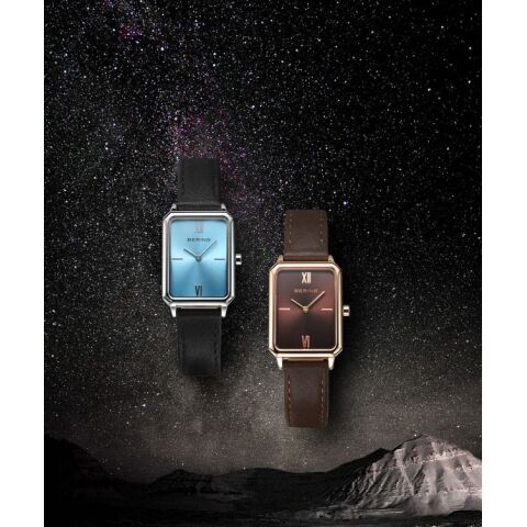 文字盤デザインは、12時と6時位置にBERINGでは珍しいローマ数字を、3時と6時位置にバーを配し、それ以外のインデックスを省くことで、全体をすっきりとした美しい印象に仕上げています。