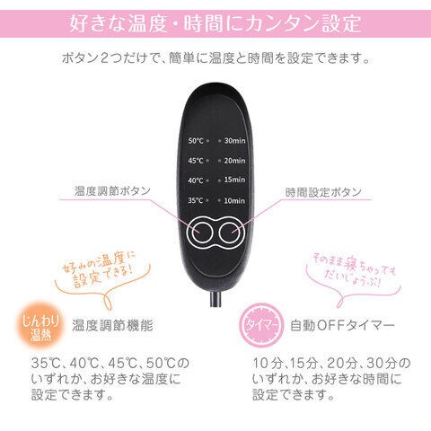35℃、40℃、45℃、50℃のいずれかお好きな温度に、10分、15分、20分、30分のいずれかお好きな時間にそれぞれ設定できます。