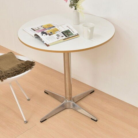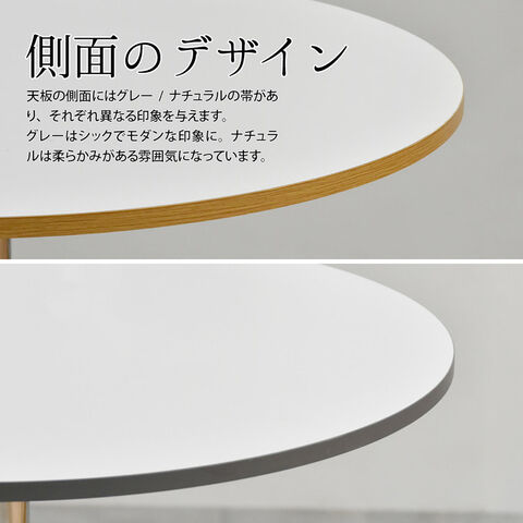 ラウンド天板のカジュアルな雰囲気とモダンな質感のテーブル脚との組み合わせ