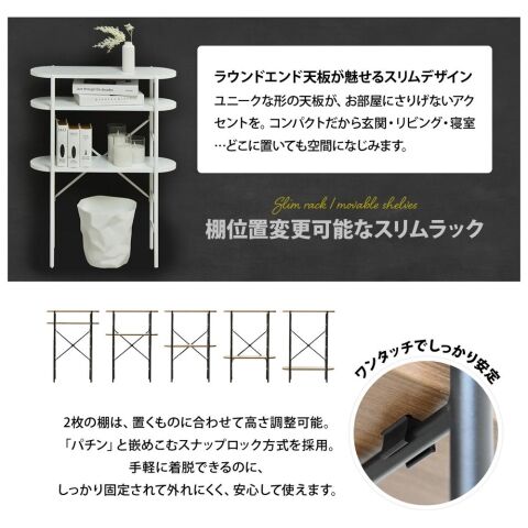 2枚の棚板は置くものに合わせて高さ調節可能。手軽に着脱出来るスナップロック方式を採用。外れにくくて安心です。