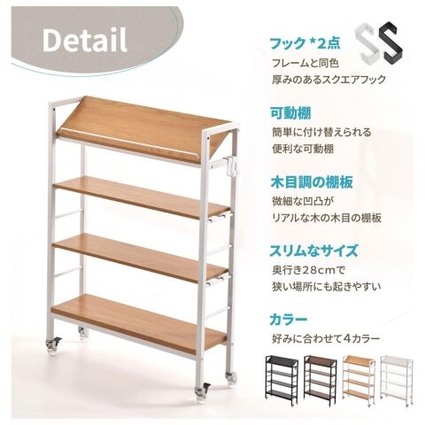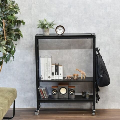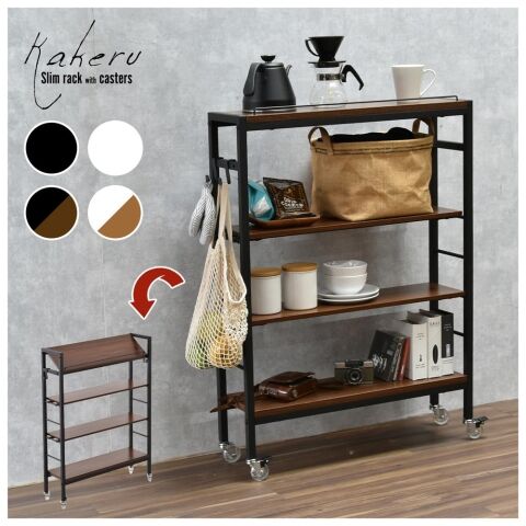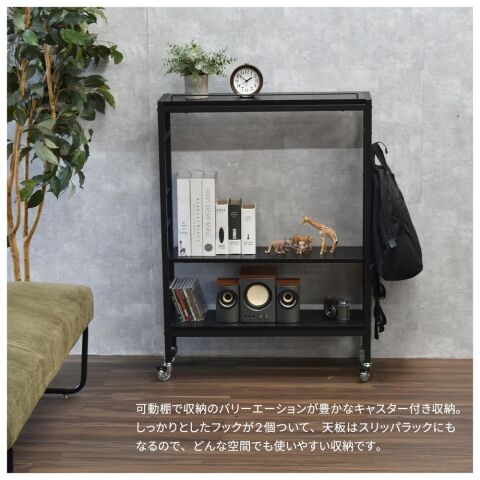玄関やリビングなど圧迫感なく置くことができる可動棚とオシャレなキャスターがついたスリム収納ラック