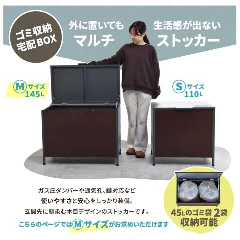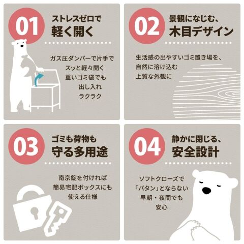 ゴミ収納だけでなく、南京錠等を付ければ簡易宅配ボックスにも使える仕様。