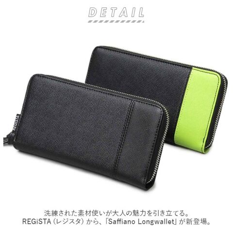 REGiSTAロングウォレットでは2種類のサフィアーノ・フェイクレザーを貼り分け、ポップで遊び心のある仕上がりに。