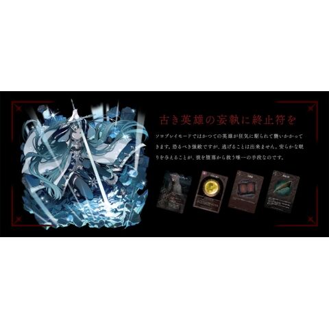 説明書×1 キャラクターカード×4 戦術カード×60 遺物カード×10 ソロプレイ用カード×12 パラメーターボード×2 ライフマーカー×2 気力マーカー×2 マナマーカー×1 残弾マーカー×1 毒マーカー×2