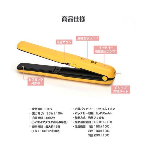 また、フル充電完了後、最大約45分間使用※段/160℃で使用時できますので、安心してしっかりスタイリングが可能です。