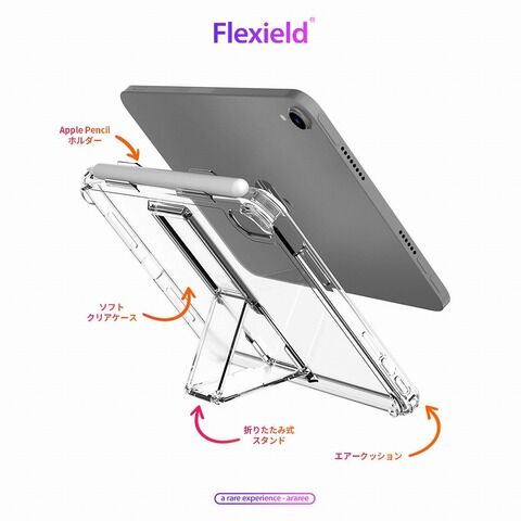 ◆ararree「FLEXIELD ペンホルダー付きスタンドケース」は 2通りの角度で固定できる折りたたみ式スタンドと Apple Pencilが収納できるホルダーが付いた、機能的なソフトクリアケースです。