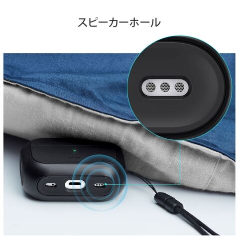 ケースの底面にはAirPods Pro2に合わせてスピーカーホールを設け、操作音やアラーム音を妨げない設計になっています。