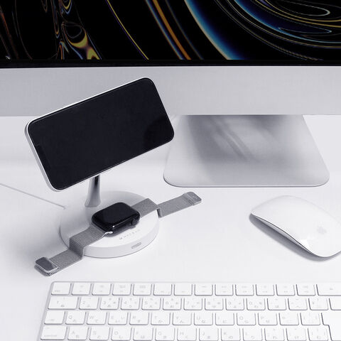 スタンド基部の充電パッドでは、QiデバイスやAirPodsのみならず、Apple Watchも充電可能です。Apple Watch専用の充電スペースを必要とせず、ひとつの充電エリアが様々なワイヤレス充電に対応するミニマル充電器です。