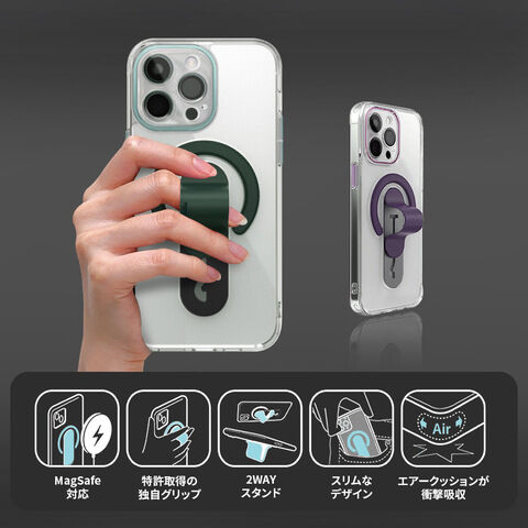 ◆「Mag Grip レンズガード一体型クリアケース」は特許取得の独自グリップを取り付け、カメラ部にはガラスフィルム製レンズカードが設けられたMagSafe対応のクリアケースです。