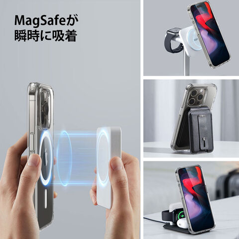 背面に強力なマグネットを搭載しており、ケースを装着したままMagSafeの高速ワイヤレス充電が可能です。スタンドやウォレットなど、各種MagSafeアクセサリも使用できます。