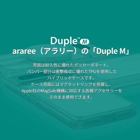 ◆arareeの「DUPLE M」は、背面は耐久性に優れたポリカーボネート、バンパー部分は衝撃吸収に優れたTPUを使用したハイブリッドケースです。