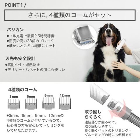 ◆静音設計でペットも怖がらず、4種類のアタッチメントで初心者でも安心してカット可能。
