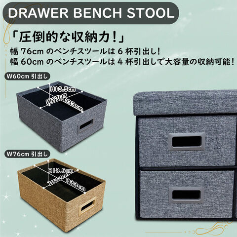 ◆幅76cmのベンチスツールは6杯引出しで大容量の収納可能。