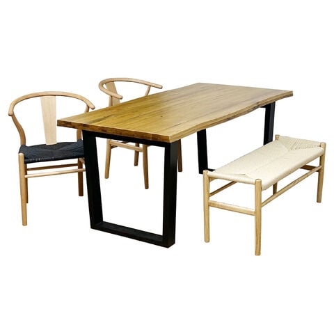 ◆一枚板風オーク無垢材を使用した高級感ある幅160cmダイニングテーブル4点セット。ベンチNA色1脚。