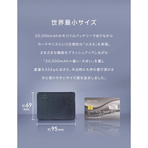 20000mAhのモバイルバッテリーでありながらカードサイズの圧倒的な小ささを実現。