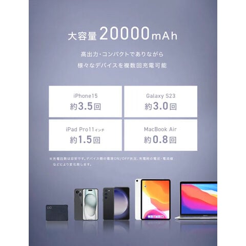高出力・コンパクトでありながら、iPhone15なら約3.5回、Galaxy S23なら約3.0回、iPad Pro 11インチなら約1.5回、MacBook Airなら約0.8回など、