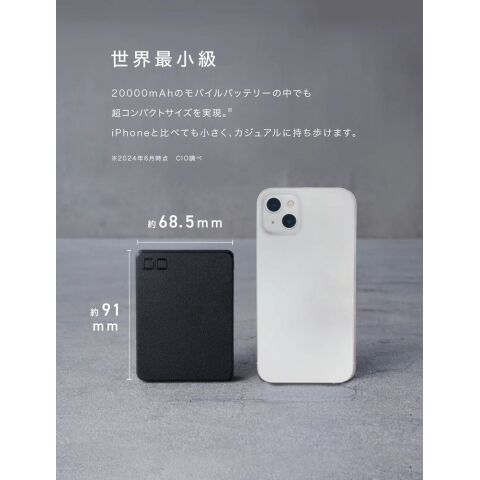従来の20000mAhモバイルバッテリーと比較し、約3分の2の体積を実現(CIO製品との比較)。
