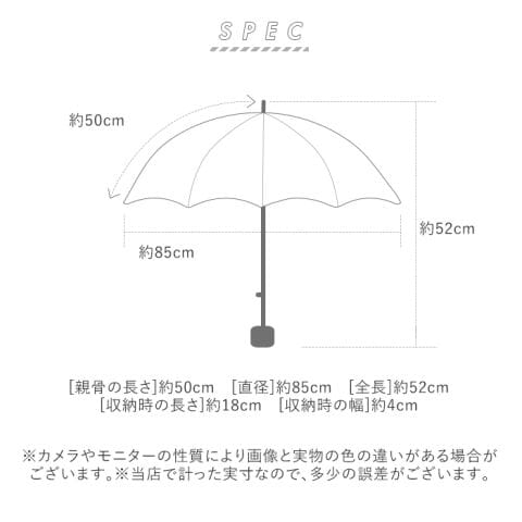 - サイズ(約):[親骨の長さ]50cm [直径]85cm [全長]52cm [収納時の長さ]18cm [収納時の幅]4cm