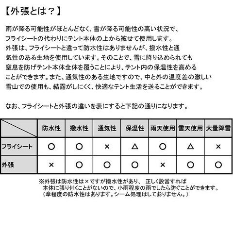 - ※外張は、フライシートと違って防水性はありませんが、撥水性と通気性のある生地を使用しています。雪が降る可能性が高い状況下で窒息を防げ、テント本体を覆うことにより、保温性を高めることができます。
