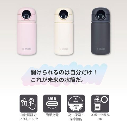 指をかざすだけでスマートにロック解除。登録した指紋でのみフタとキャップを開けられる次世代の安心設計ボトル。