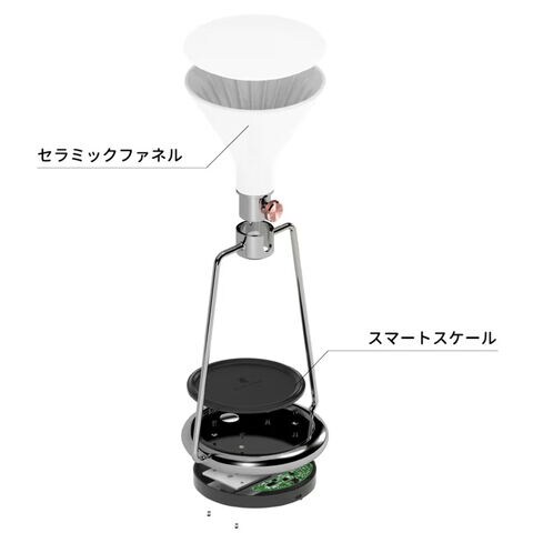 たとえばコーヒー豆をセラミックファネルに入れると、アプリ画面に抽出量が表示されるので、それに従ってお湯を注ぎます。