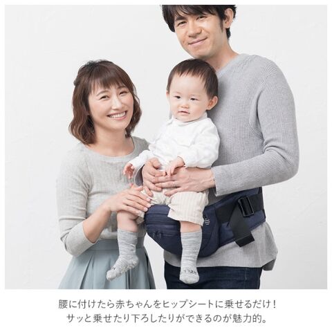 腰に付けたら赤ちゃんをヒップシートに乗せるだけ! サッと乗せたり下ろしたりができるのが魅力的。
