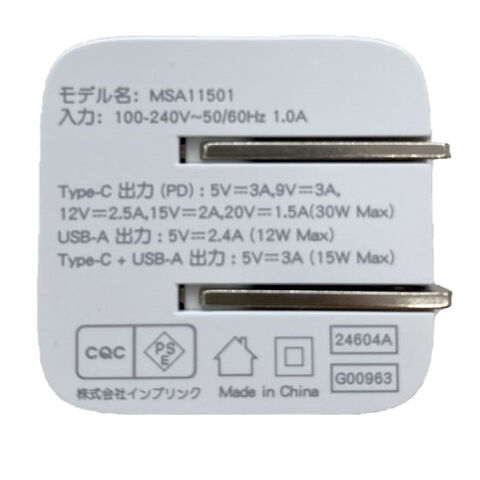 - 出力(Type-Cポート):[PD]DC5V/3A9V/3A12V/2.5A15V/2A20V/1.5A(最大出力30W)