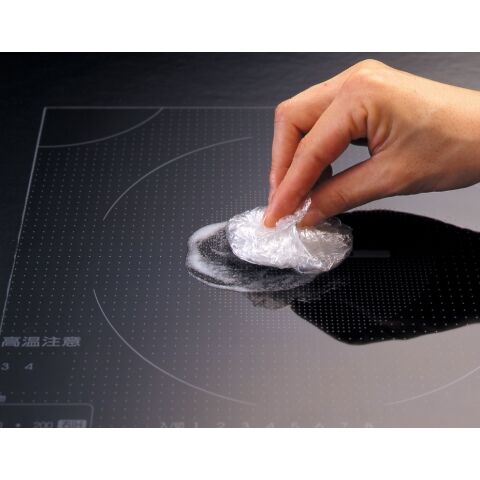 ◆ガラスにキズがつきにくく、丸めたラップでこするとスッキリきれい! ガンコなコゲつき汚れを落とします。