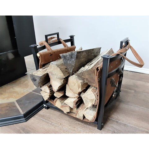 ◆本革(一部合皮)製のログキャリーは、たっぷりの薪が運べ、そのままログラックにセットできます。