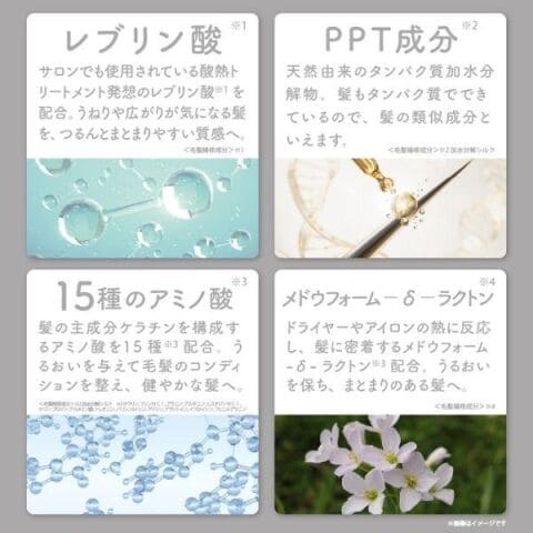 ■成分:水、ジメチコン、セタノール、グリセリン、トリ(カプリル酸/カプリン酸)グリセリル、グルタチオン、加水分解シルク、レブリン酸、メドウフォーム-δ-ラクトン、ラウリルカルバミン酸イヌリン、タウリン、リシンHCl、アラニン、アルギニン、ヒスチジンHCl、セリン、プロリン、グルタミン酸、トレオニン、バリン、ロイシン、グリシン、アラントイン、イソロイシン、フェニルアラニン、ステアルトリモニウムクロリド、セテアリルアルコール、ベヘントリモニウムクロリド、香料、BG、トコフェロール、フェノキシエタノール、EDTA-2Na、メチルパラベン、プロピルパラベン