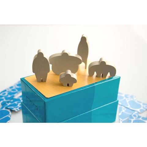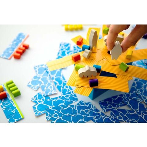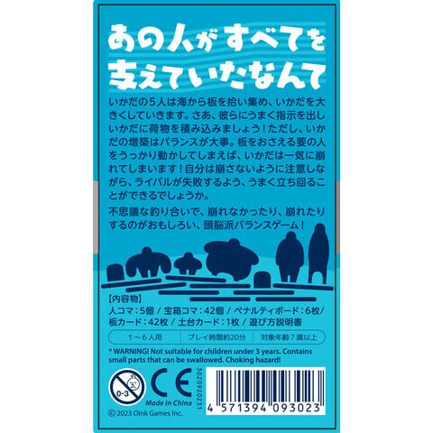 『いかだの5人』は、さまざまな形の5つの人コマをうまく使っていかだを大きくしながら、宝箱を積んでいくバランスゲーム。