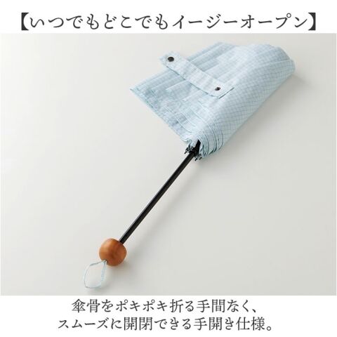 丸みのあるフォルムが可愛い! 木目調のハンドルが、傘生地と素敵にマッチ。