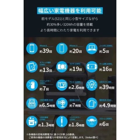 ※充電回数は各機器の定格消費電力に基づく計算上の数値 (Anker調べ) 。ご使用の機器の消費電力や使用状況により変動します