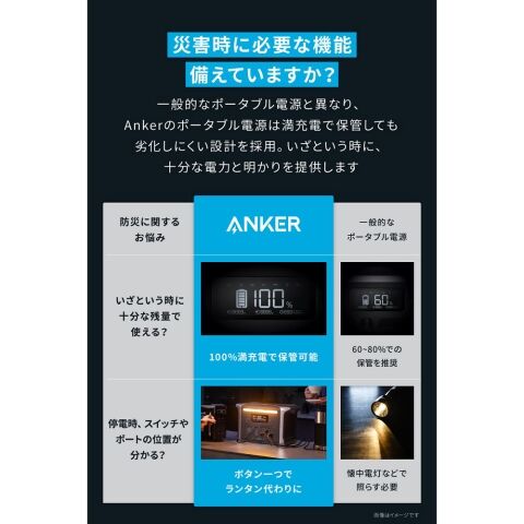 本製品は100%満充電での保管が可能なため、もしもの時に最大限の電力を活用できます。