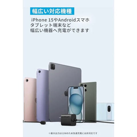 • パッケージ内容:Anker Charger (12W Built-In 1.5m USB-C ケーブル)、取扱説明書、18ヶ月保証 + 6ヶ月 (Anker会員登録後) 、カスタマーサポート
