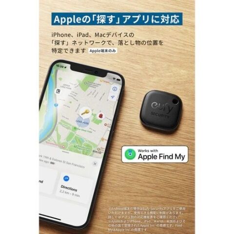 ※iOSの「探す」アプリ、Android OSの「Eufy Security」アプリに対応。Bluetooth接続範囲を離れて約3分後に通知が届きます。位置情報の利用許可を「常に」設定する必要があります
