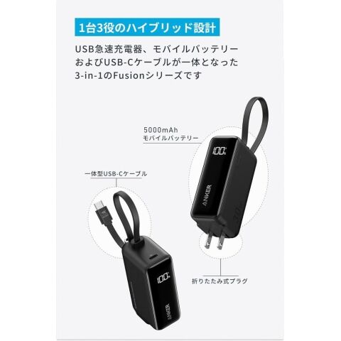 Anker モバイルバッテリー USB-C×1ポート USB-Cケーブル一体型 5000mAh(ブラック) Anker Power Bank (30W Fusion Built-In USB-C ケーブル) A1636N13 【返品種別A】のレビュー
