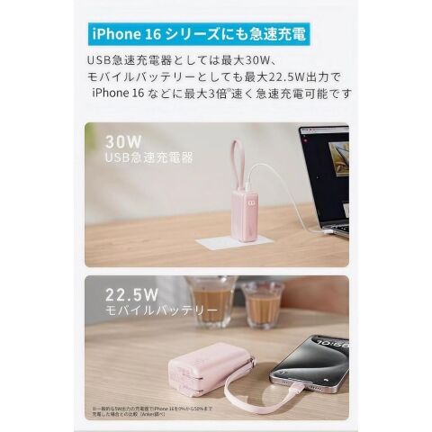 USB急速充電器としては最大30W、モバイルバッテリーとしても最大22.5W出力で、iPhone 15などに最大3倍※速く急速充電可能です。