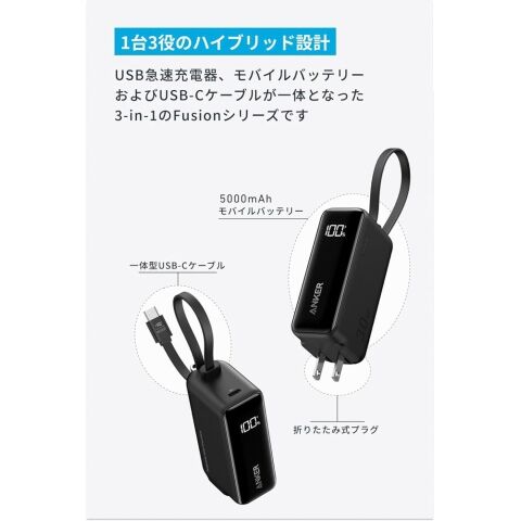 USB急速充電器、モバイルバッテリーおよびUSB-Cケーブルが一体となった3-in-1のFusionシリーズ。