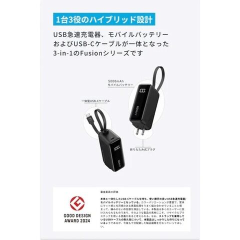 USB急速充電器、モバイルバッテリーおよびUSB-Cケーブルが一体となった3-in-1のFusionシリーズ。