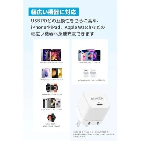 - iPad(第10世代)/ iPad(第9世代) 他 - パッケージ内容:Anker PowerPort III 20W Cube、USB-C & ライトニングケーブル (0.9m) 、取扱説明書、18ヶ月保証 + 6ヶ月 (Ankerで会員登録後) 、カスタマーサポート