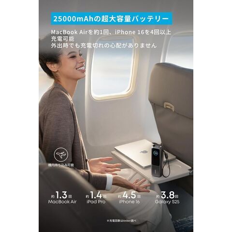 25000mAhの超大容量かつ単ポート最大100W出力が可能なため、長時間の外出時や出張先でもノートPCからスマートフォンまで幅広い機器へ同時に急速充電が可能。