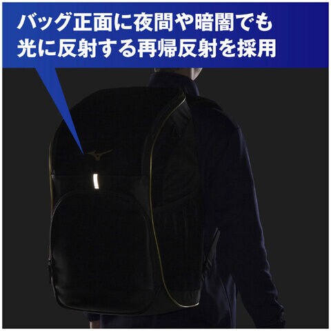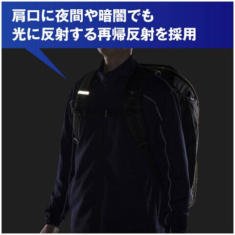 ◆肩口とバッグ正面に夜間や暗闇でも光に反射する再帰反射を採用。