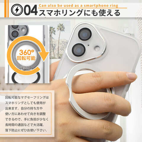 回転可能なマグセーフリングはスマホリングとしても使用可能。手に負担が少なく長時間の通話等で大活躍。