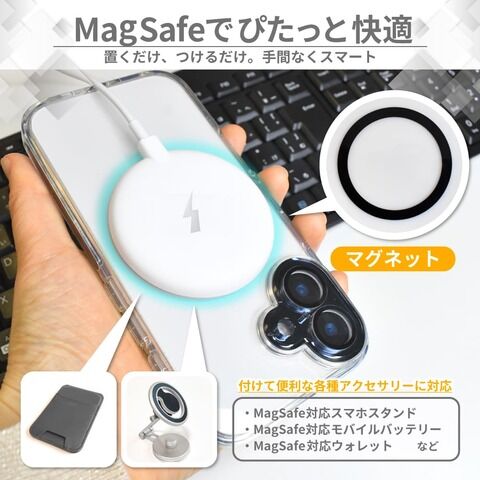 ワイヤレス充電対応で、装着したままスムーズに充電可能。MagSafeの吸着力により、充電中に持ってもズレずに安定。