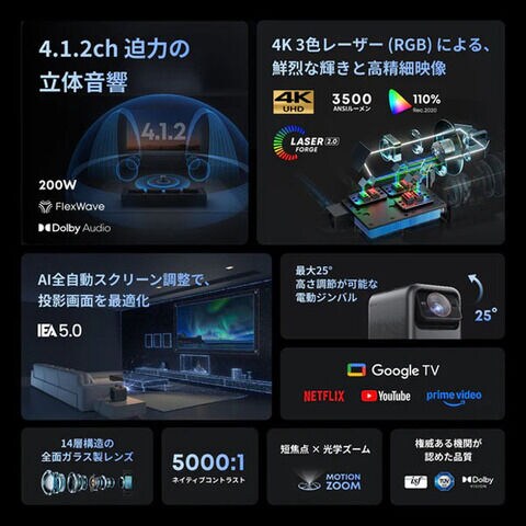3色レーザー短焦点プロジェクター/高音質低遅延Wi-Fiスピーカー