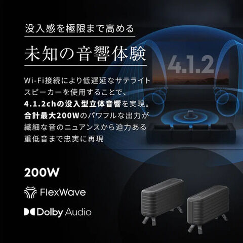 サテライトスピーカーにより実現した4.1.2chの没入型立体音響と、合計最大200Wの圧倒的な出力が生み出す迫力のサウンドで、聴こえるを超えた、「感じる」究極の没入体験。