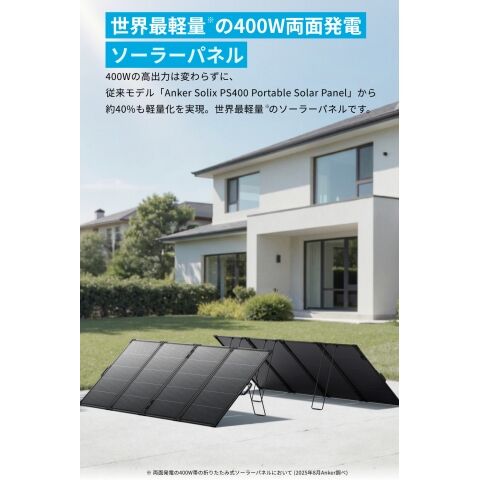 ※両面発電の400W帯の折りたたみ式ソーラーパネルにおいて(2025年8月Anker調べ)