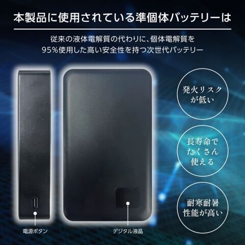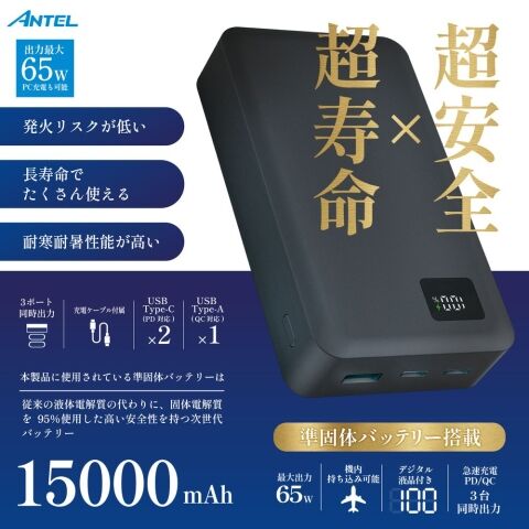ANTEL 準固体モバイルバッテリー 15000mAh PD65W 充電ケーブル付き(ブラック) YSN B1-MB001BK 【返品種別A】