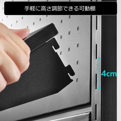 棚板のフックをフレームの切り欠きに引っ掛けるだけ。工具なしで、簡単に棚板位置の調節(4cm間隔)が可能です。